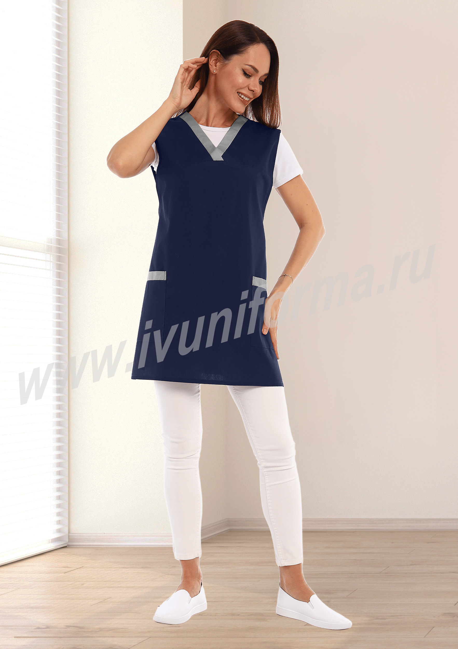 Фартук средней длины, перекидной. Спинка без отделки. Полочка с отрезной кокеткой, декорированной отделочными планками, выполненными из ткани контрастного цвета. В нижней части фартука имеются два накладных вместительных кармана с отделочными планками. Объем фартука регулируется завязками – поясами. Изделие изготовлено из легкой и прочной ткани, с водоотталкивающей пропиткой, что придает фартуку универсальность при использовании его для защиты от общепроизводственных загрязнений.