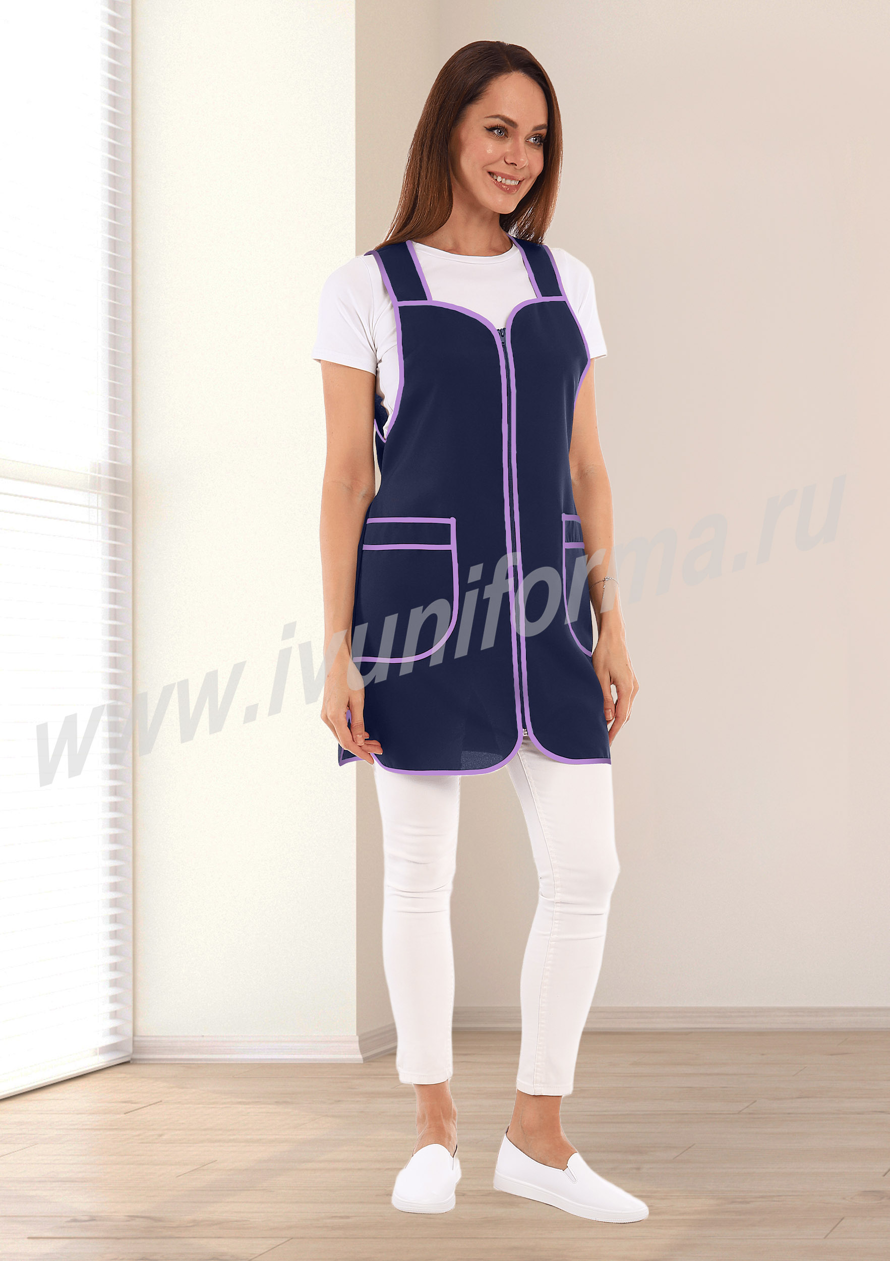 Сарафан женский укороченный прямого силуэта с центральной застежкой на молнию. На полочках в боковых швах расположены вместительные карманы округлой формы. Спинка без отделки с двумя завязывающимися полупоясами для регулировки объема по линии талии. Для увеличения прочности сарафана выполнено дополнительное усиление швов центральной застежки. Все срезы сарафана обработаны износостойким однотонным нейлоновым кантом. Сарафан удобен и прост в уходе, предназначен для защиты от общих производственных загрязнений.