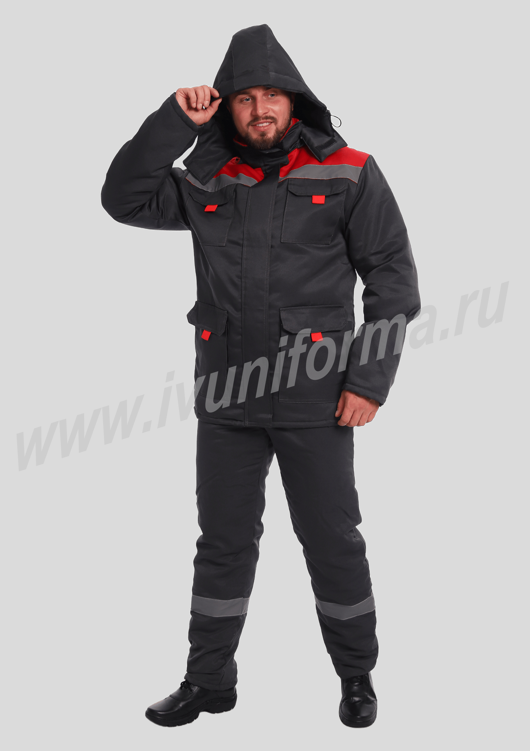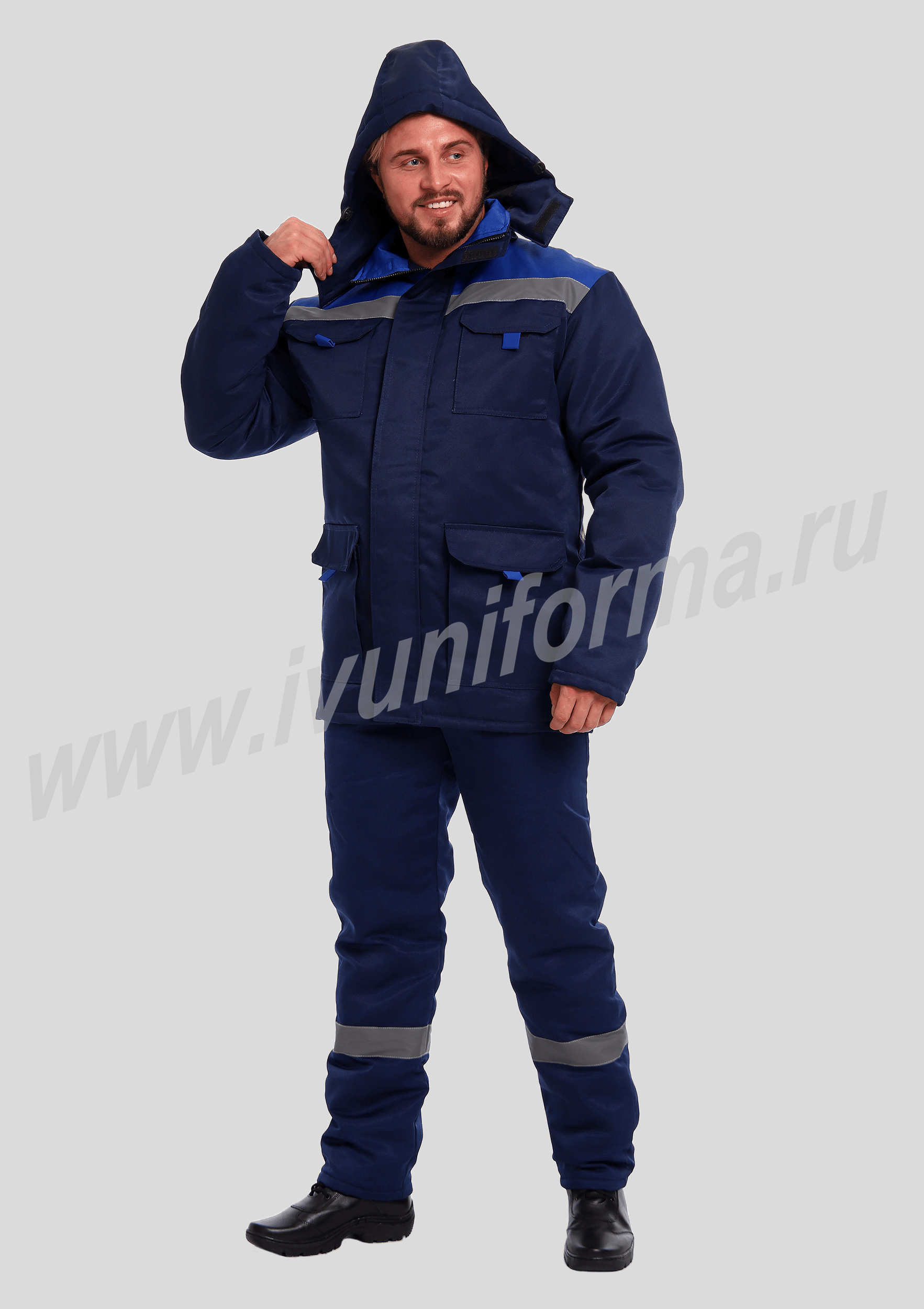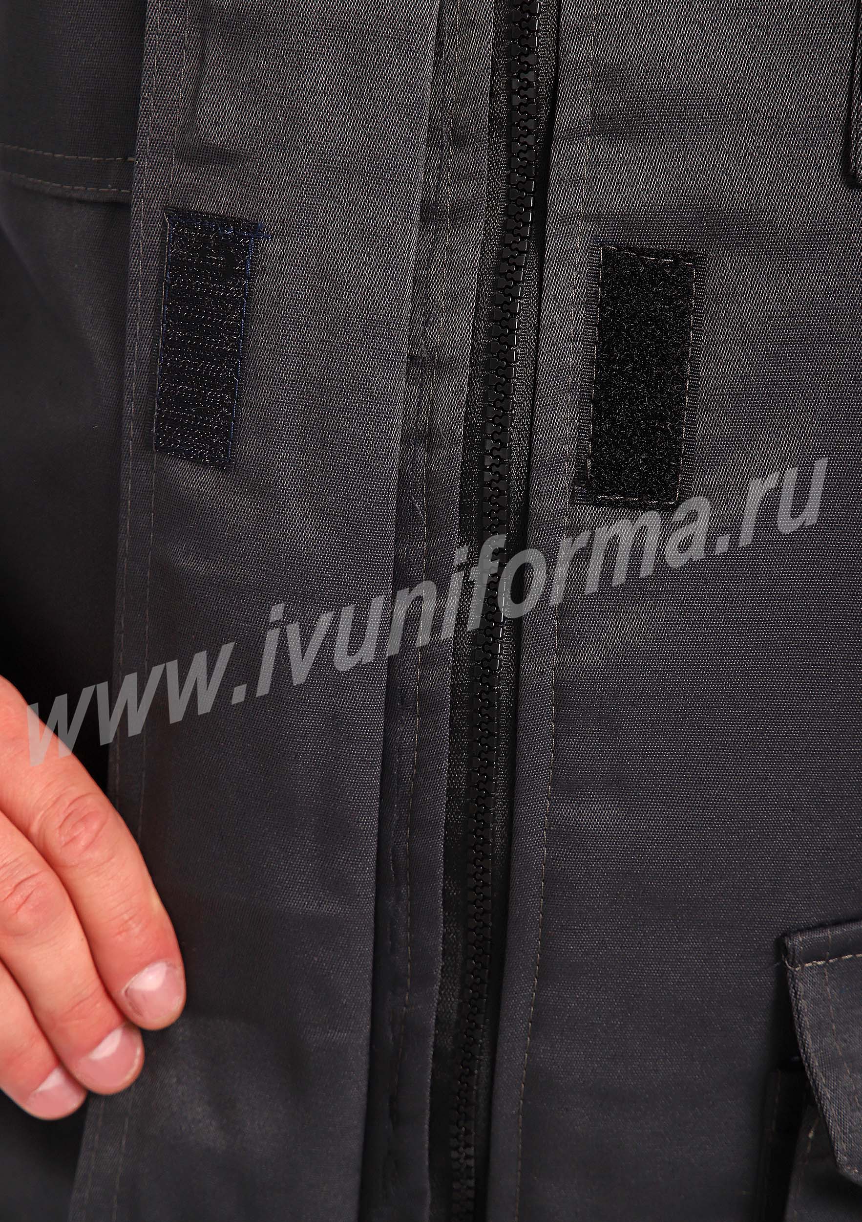 Костюм рабочий утепленный мужской состоит из куртки и полукомбинезона. Куртка удлиненная с воротником стойкой, прямого силуэта с застежкой на тракторную молнию с ветрозащитным клапаном на липучках "Velcro". На куртке два нагрудных и два нижних накладных кармана с клапанами и застежками на липучку "Velcro". Капюшон съёмный, на молнии ,с возможностью регулировки объема по лицевой части. Полукомбинезон прямого силуэта, с застежкой на две пуговицы и молнию. На брюках два передних кармана с косой линией входа. Однослойное утепление брюк объемом 200 гр/кв.м.
